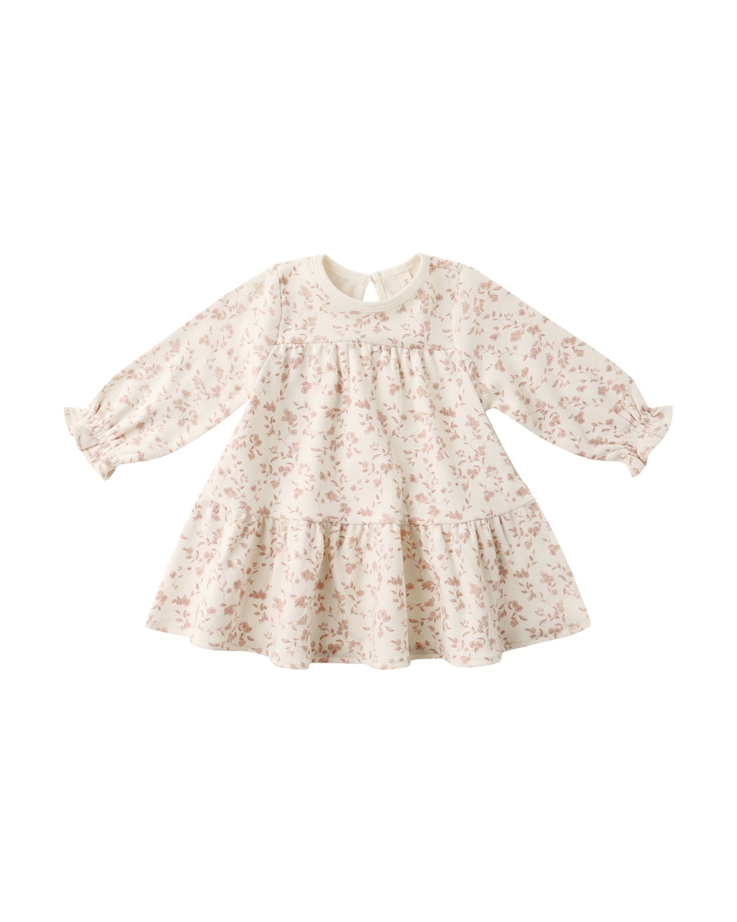 Long sleeve dress featuring soft tiered layers and a coconut button closure at the back. Coordinating bloomers included with all sizes.