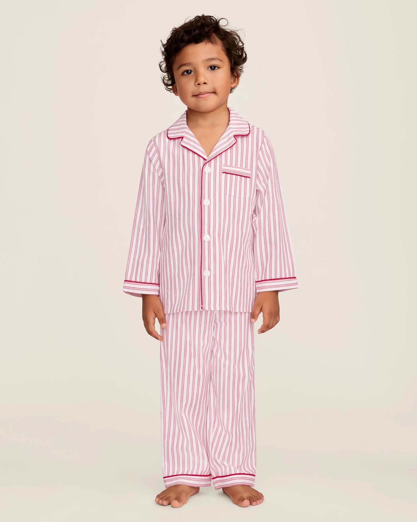 A new take on a classic pattern, with no frills just clean, crisp lines. This classic pajama set is accented with red piping and finished with pearl buttons.