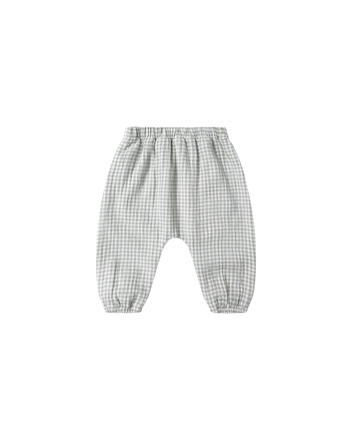 Woven pants with an elastic waistband and leg openings, designed with a dropped crotch for a relaxed, easy fit.
