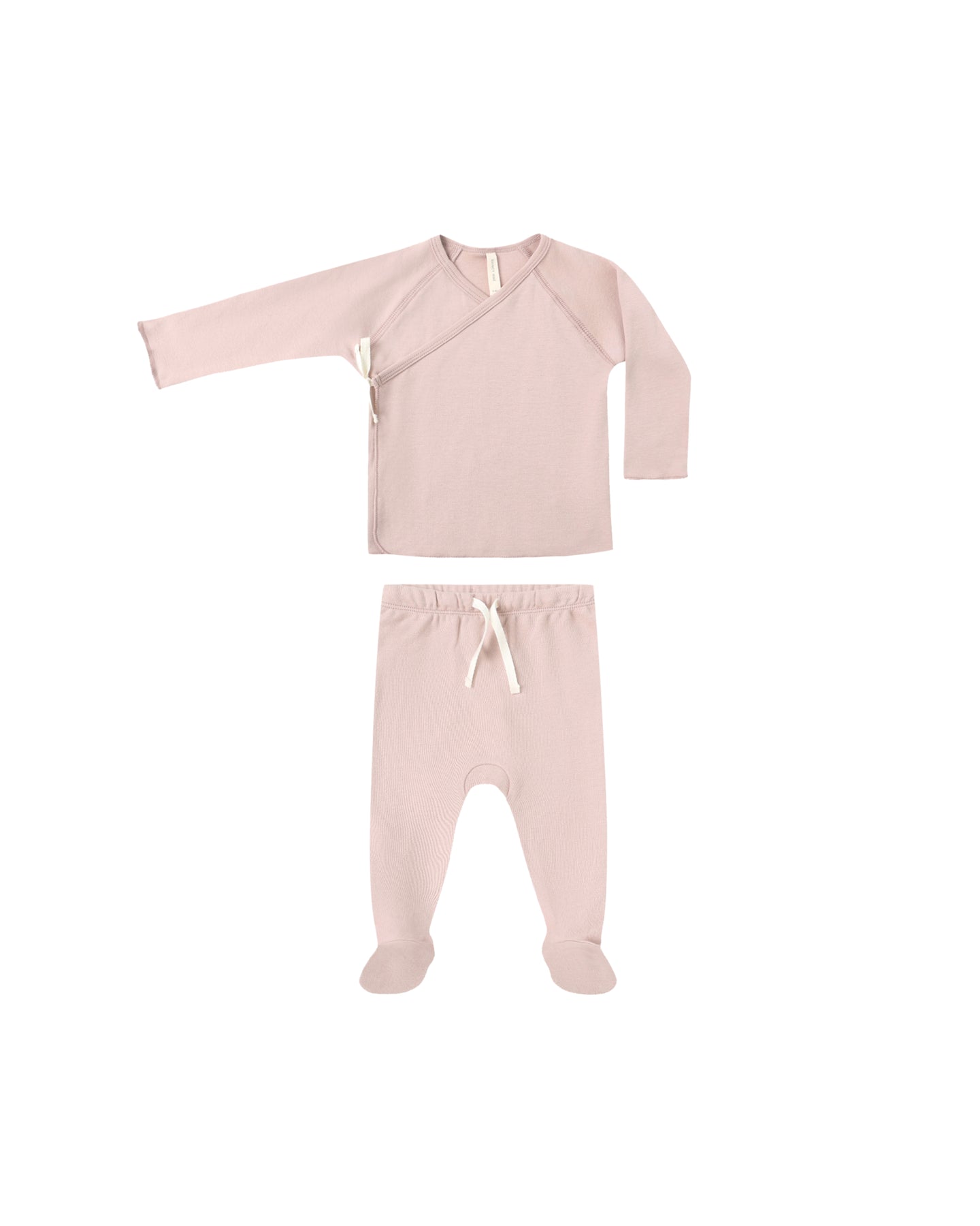 Bring baby home in this sweet set, featuring a long sleeve wrap top with an inside snap and a side tie, paired with matching drawstring footed pants for a cozy, coordinated look.
