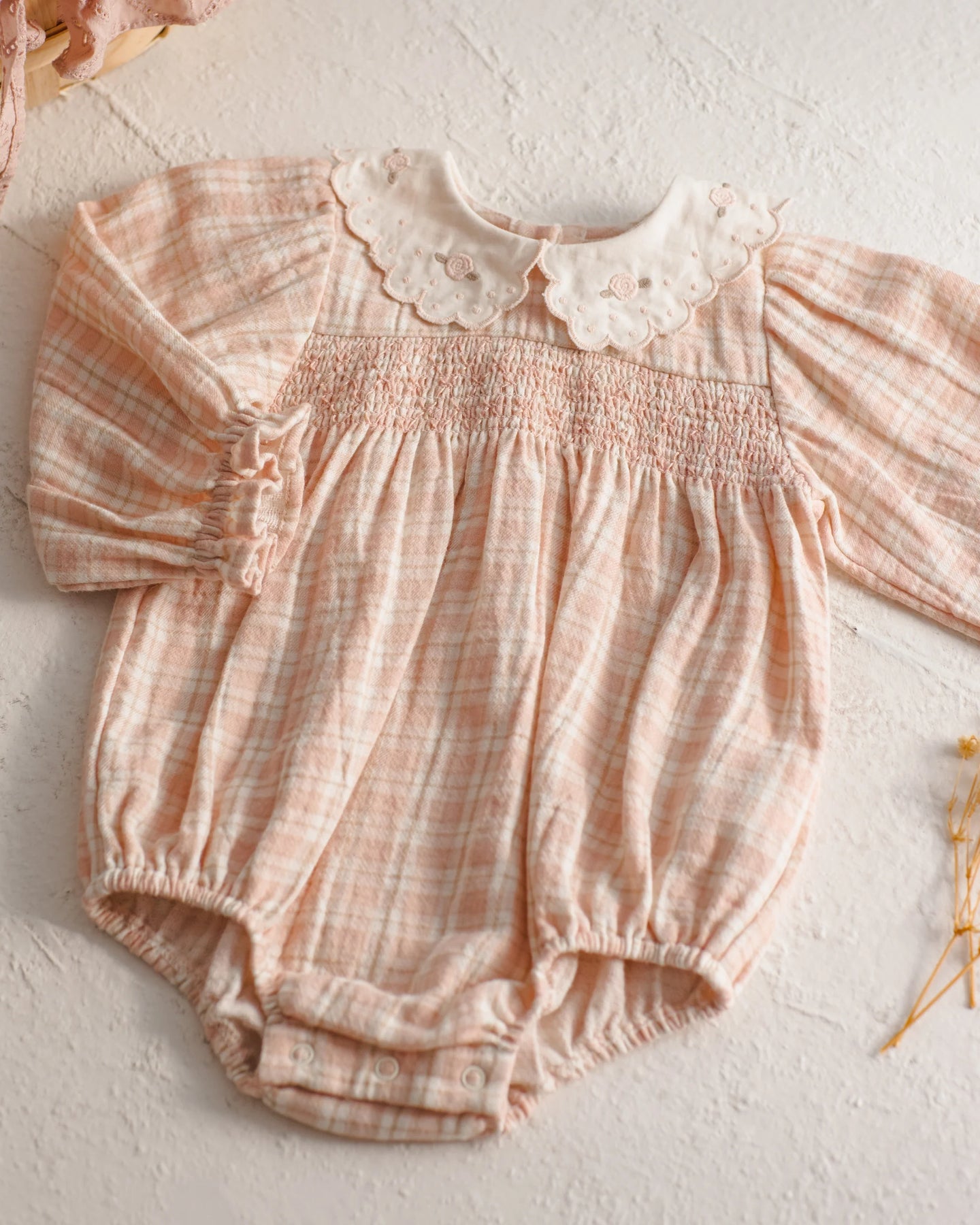 We are loving this precious style! The Callie Romper comes with an embroidered collar, smocked front, gathered long sleeves, buttons at the back and snaps at the bottom for easy wear.