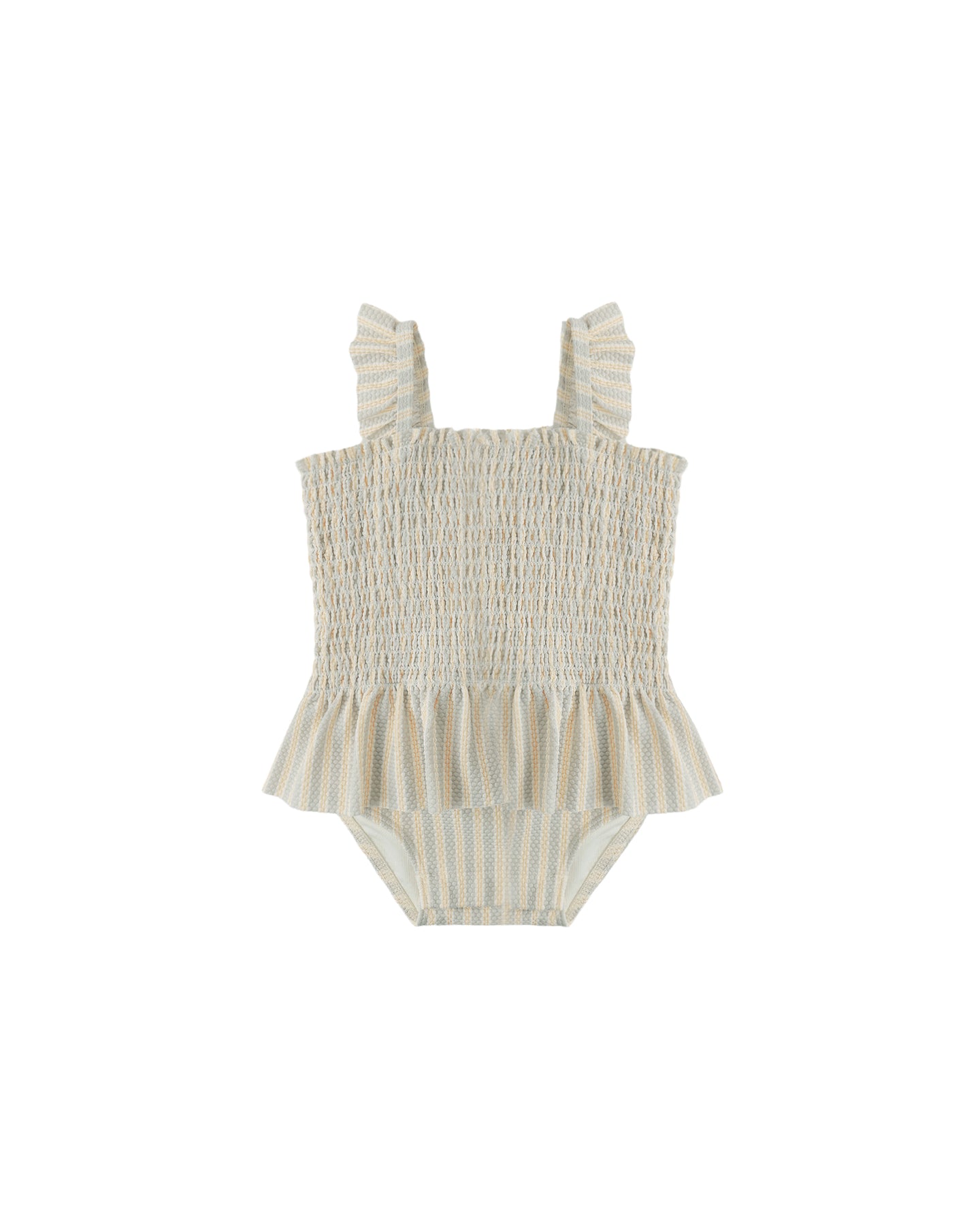 Our Smocked One-Piece Swimsuit features a sweet smocked bodice, ruffle sleeves, and ruffle peplum skirt.